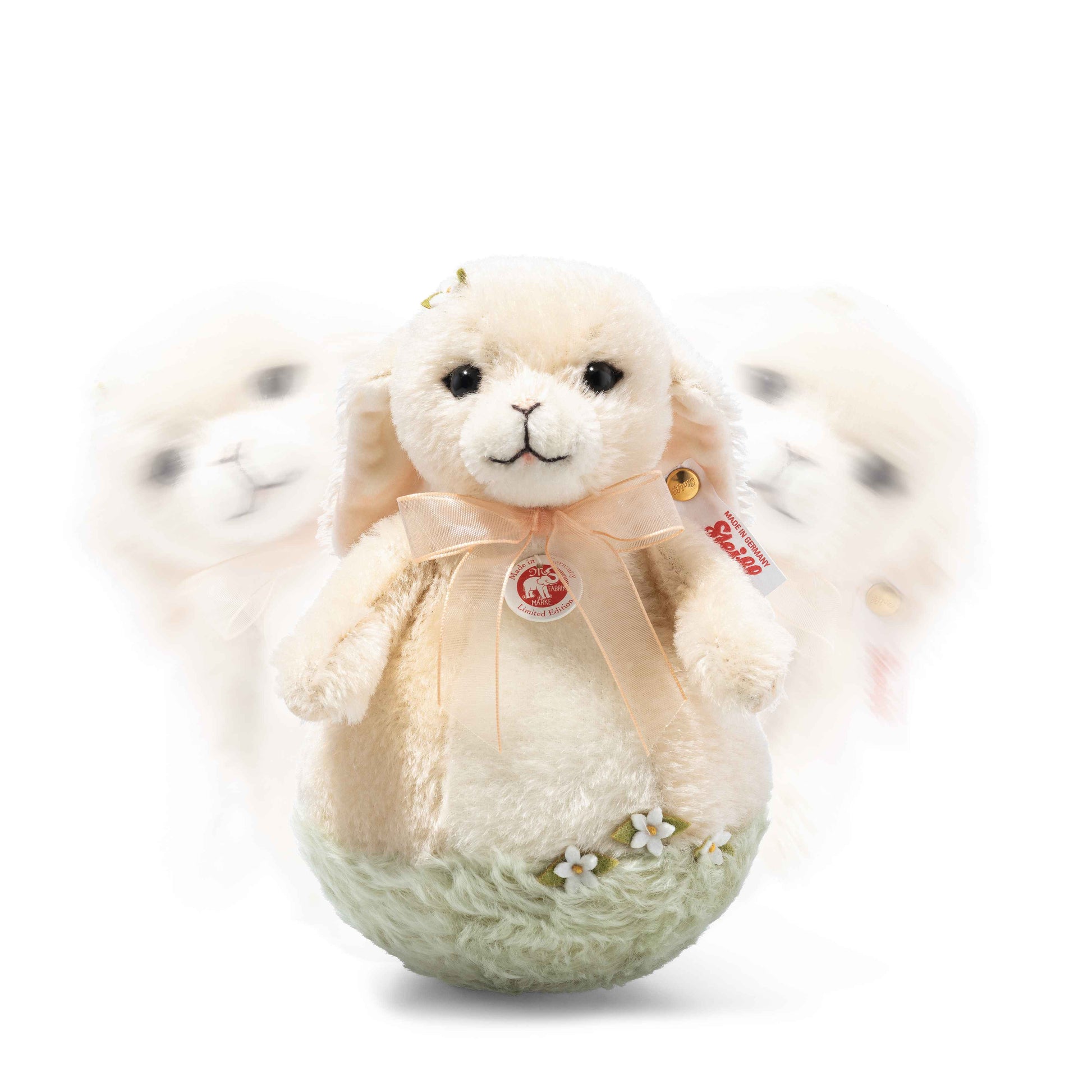 Die Steiff Roly Poly Tiere erschienen erstmals 1909. Sie sind ständig in Bewegung, ihr einzigartiger kugelförmiger Körper mit Stehauffunktion sorgt dafür, dass sie niemals umfallen. Nach unserer Schneeeule freuen wir uns, Ihnen nun den zweiten Teil der Serie anbieten zu können, unser liebenswertes Roly Poly Frühlingshäschen, welches die Freude am Frühling einfängt. Zart verziert mit Frühlingsblumen und einem raffiniert gestalteten Sockel, der eine grasbewachsene Blumenwiese darstellt. Ihre frische apricotfarbene Schleife passt perfekt zur Jahreszeit. Während sie schwingt und nach rechts und links schaukelt, lässt sie alle ihre Freunde wissen: „Hurra der Frühling ist da“