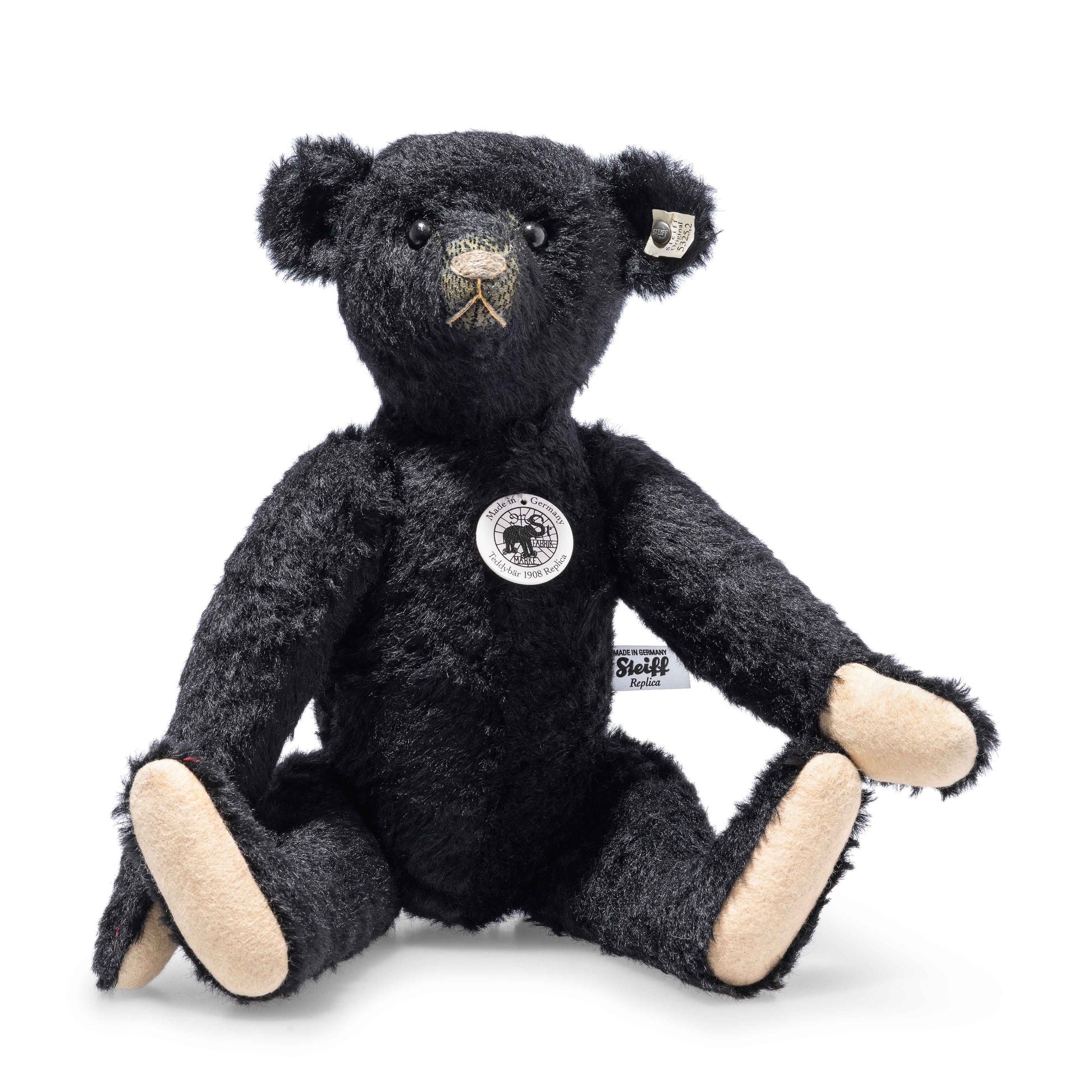 Im Jahr 1908 wurden sechs farbige Teddybären zur Präsentation in London in Auftrag gegeben. Vier von ihnen wurden seitdem nie wiedergesehen: der rosafarbene, gelbe, grüne und der schwarze Teddybär. Bis jetzt. Dank eines leidenschaftlichen und sachkundigen Steiff Sammlers wurde ein nie zuvor gesehener schwarzer 1908er entdeckt. Bruno ist sein Name und er ist einzigartig und unwiderstehlich. Seine Replik ist in mühevoller Kleinarbeit und hohem Aufwand entstanden. Unser Archivar und unsere Designer waren augenblicklich von Brunos Details fasziniert. Die Schnittführung und ganz besonders die rot garnierten Krallen weisen eindeutig auf eine frühe Entstehungszeit hin. Unser Archivar war auch von Brunos ungewöhnlichem, zusätzlichem Maulstich überrascht, denn vergleichbares findet sich auch an dem ersten schwarzen Teddybären wieder, welcher 1907 als Prototyp hergestellt wurde und den Richard verwendete, um den Teddybären lebensechter wirken zu lassen.